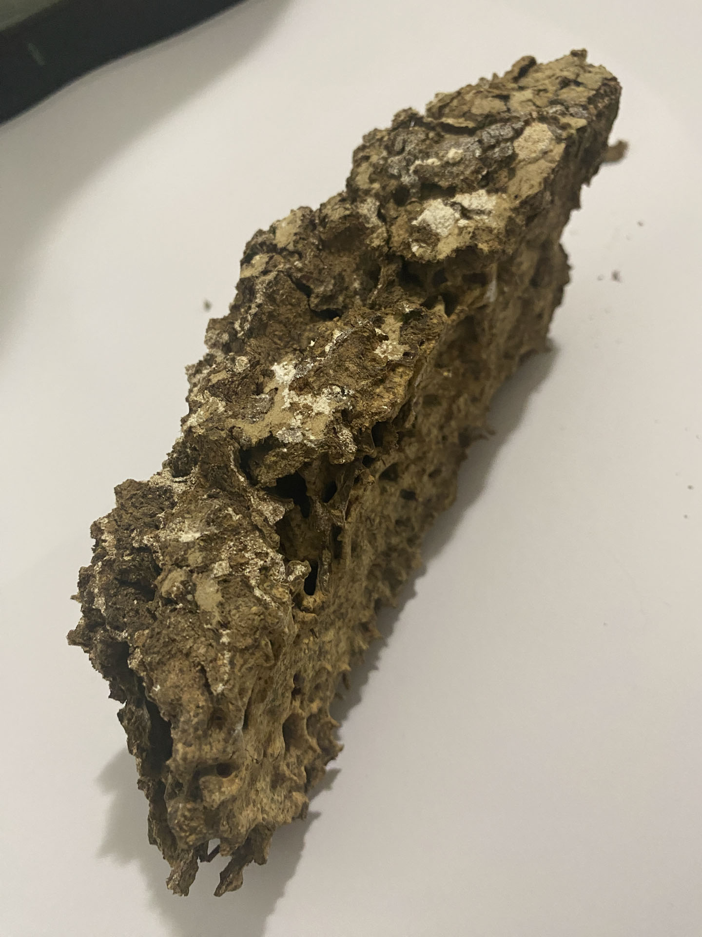 Termite mudding, as shown in this photo, can be found connected to house structures including timbers, wall coverings and more.  Finding termite mudding is a strong indicator that there is damage from termites somewhere…